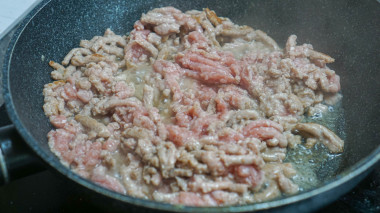 В сковородке с высоким бортом обжарим на сильном огне фарш в течение минут 5-6.