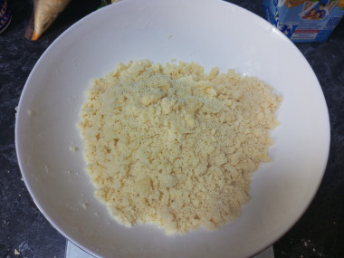 В чашу блендера всыпьте муку, сахар и разрыхлитель. Добавьте нарезанное кусочками сливочное масло. Взбейте все в мелкую крошку. Если блендера нет, можете перетереть все руками.