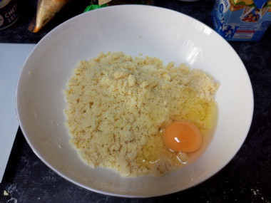 Пересыпьте крошку в миску, добавьте яйцо и быстро замесите песочное тесто. Как только тесто начнет скатываться в единый шар, оно готово. Долго месить его не нужно, иначе основа пирог получится жесткой. Подробнее о песочном тесте читайте в статье по ссылке в конце рецепта.
