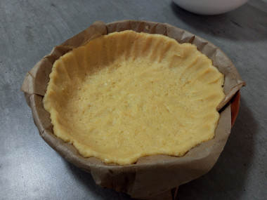 Распределите тесто по дну и бортикам формы для выпечки диаметром (Ø 20-21 см). У меня кулинарное кольцо, но можете использовать обычную разъемную форму. Информацию о формах для выпечки вы найдете в конце рецепта под шагами. Если боитесь, что пирог прилипнет, застелите форму пергаментом или смажьте её растительным или сливочным маслом - с выбором помогут статьи под рецептом.