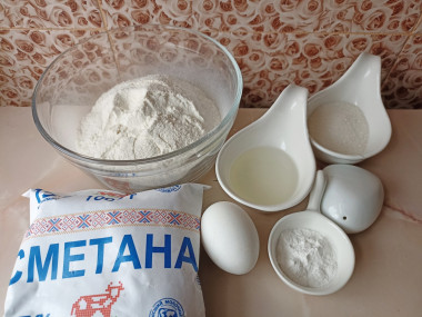 Как сделать печенье без выпечки в домашних условиях? Подготовьте продукты. Количество муки дано примерное, может уйти как больше, так и меньше. О свойствах муки подробнее читайте в отдельной статье по ссылке в конце рецепта. Будете смотреть по тесту. Яйцо возьмите первой категории, сметану — жирностью 20%. Вместо растительного масла без запаха можете использовать растопленное сливочное.