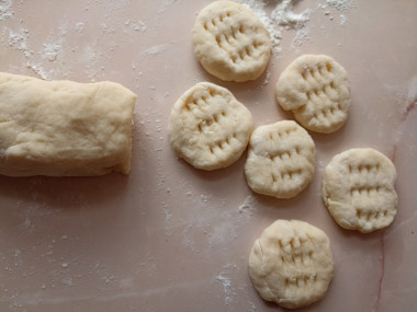 Сформируйте печенье. Вы можете скатать из тесту колбаску и нарезать ее колечками. Или, как я, отщипывать от теста кусочки и скатать из них шарики, величиной с грецкий орех. Затем шарики расплющите в лепешки толщиной 5мм. Вилкой сделайте на заготовках узор. Если тесто будет липнуть, подсыпьте немного муки. О всех нюансах работы с разрыхлителем читайте в отдельной статье, ссылка в конце рецепта.