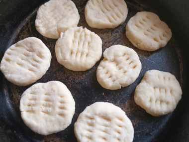 Поставьте на небольшой огонь сковороду с толстым дном и антипригарным покрытием. Немного прогрейте ее. Выложите на сухую сковороду заготовки печений. О том, как подобрать идеальную сковороду, читайте в отдельной статье, ссылка в конце рецепта.
