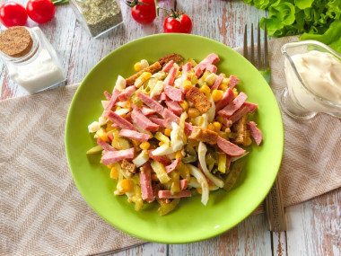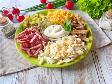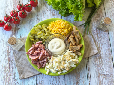Осталось собрать салат, добавив в него кукурузу и сухарики. Вы можете просто сложить все ингредиенты в салатник, добавить майонез и перемешать. Мне больше нравится подача на плоской тарелке, когда все составляющие лежат отдельными кучками. Для этого возьмите блюдо, в центр поставьте соусник с майонезом, а вокруг разложите нарезанные колбасу, огурцы, яйца, кукурузу и сухарики. При такой подаче, кстати, сухарики не размокнут от влажности других продуктов.