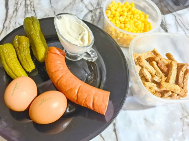 Как сделать салат закусочный с колбасой и солеными огурцами? Подготовьте продукты. Колбасу возьмите любую копченую, главное, чтобы она была вкусной. Огурцы подойдут также любые — можете использовать покупные или домашние. Яйца предварительно отварите и остудите. Сухарики можете пожарить сами или взять готовые. Кукурузу откиньте на сито, чтобы стекла лишняя жидкость.