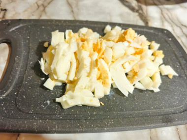 Отваренные и остуженные яйца очистите от скорлупы и также нарежьте соломкой.