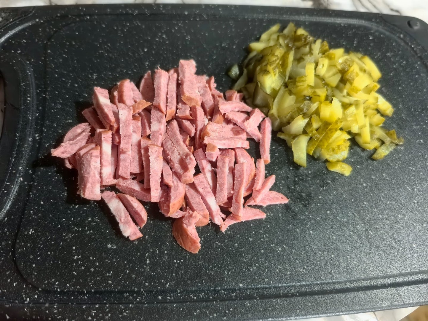 Колбасу очистите от пленки и нарежьте сначала на колесики, а затем тонкой соломкой. Вообще способ нарезки салата выбирайте сами — мне больше нравится соломкой, вы можете резать на кубики.