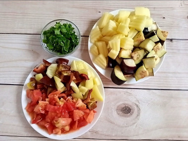 Баклажаны, перец, картофель и помидоры нарежьте небольшими кубиками.
