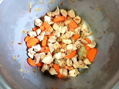 В состав внесла небольшое дополнение, я просто не могу без лука и моркови. Морковь нарезала крупно, чтобы она осталась целой. На этот раз решила не оставлять мясо сырым, в прошлый раз оно спеклось единым "коржом". Мне больше нравится, когда мясо отдельными кусочками. Поэтому быстро обжарила лук, морковь и мясо, они стали первым слоем. Затем стала выкладывать овощи. Баклажаны предварительно посыпала солью, а через 15 минут промыла. Я их не чищу, для меня самое вкусное это шкурка). А вот с помидоров сняла шкурку. Для этого сделала крестообразный разрез и ошпарила помидоры кипятком, затем обдала холодной водой.