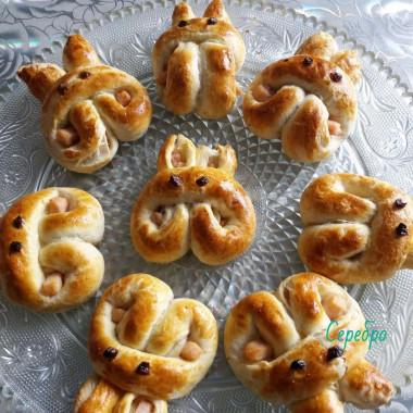 У меня тоже с сосисками, часть порезана и уложена тонкой полоской в тесто и одним брусочком сосиски скреплен каждый зайчик.