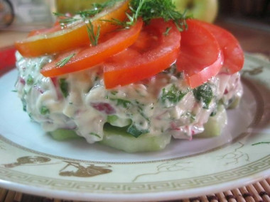 очень люблю летнее время, когда этот сезон насыщенный большим количеством витаминов. Этот салат готовится очень быстро, и за счёт помидора и яиц вкус получается очень нежным, несмотря на то что с черемшой. А на салат можно положить вместо сметаны майонез. Теперь я буду постоянно делать такой салат. Мне очень понравился.
