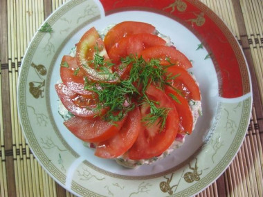 Действительно всего 15 минут заняло, если не меньше, это учитывая, что я делала его в первый раз по вашему рецепту! Чувствовать лук в салате я не люблю, поэтому я их порезала просто невероятно мелко, потом еще и в кипятке подержала. Салат получился очень ярким, вроде очень простой, поэтому хоть гостям подавай.