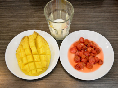 Как сделать смузи с клубникой и манго в блендере? Подготовьте все необходимые ингредиенты. Клубнику берите ароматную, спелую, сочную. Помимо клубники можно брать любые ягоды или фрукты по вкусу. Кефир можете заменить натуральным йогуртом. Или, чтобы усилить вкус смузи, взять клубничный или манговый йогурт.