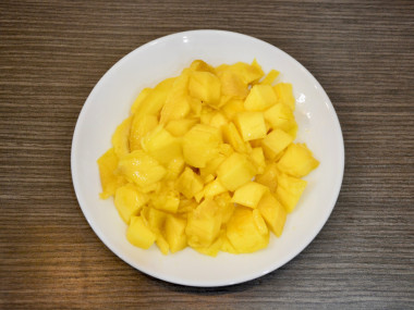 Манго вымойте, обсушите. Разрежьте плод пополам и удалите косточку. Каждую половинку очистите от кожуры и нарежьте небольшими кусочками. Важно очищать манго именно в такой последовательности. Ведь после снятия кожуры плод становится скользким. При разрезании его пополам можете порезаться. Косточка у манго крупная и плоская, мякоть плотно с ней срастается, поэтому придется повозиться.