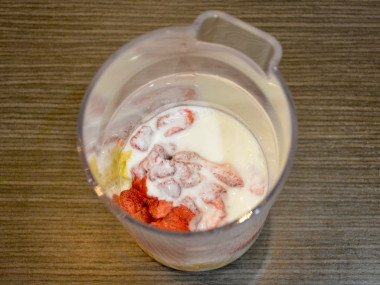 Клубнику вымойте, обсушите, удалите хвостики и нарежьте кусочками. Если клубника замороженная, предварительно ее разморозьте.