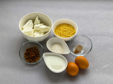 Как сделать творожную запеканку с вермишелью в духовке? Для начала подготовьте ингредиенты по списку. Творог подойдет любой, но желательно не сухой (в нем могут быть мелкие жесткие крупинки, они могут испортить общее впечатление от блюда). О том, как подобрать творог, читайте в статье по ссылке в конце рецепта. Включите духовку на 180 градусов.