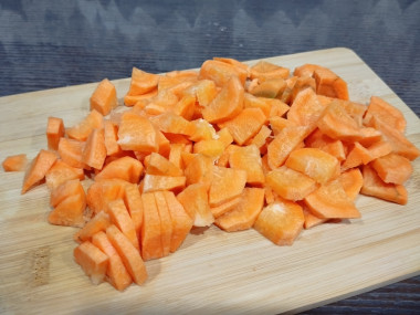 Морковь хорошенько помойте под проточной водой с щеткой. Очистите ее, обмойте и обсушите. Нарежьте морковь любым способом — на кубики, брусочки или колечки.