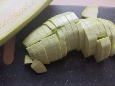 Кабачки помойте, отрежьте кончики. Нарежьте кабачки на кружочки или полукружья. Или крупными кубиками, как вам больше нравится.