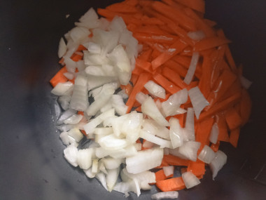 Включите на мультиварке режим, подходящий для жарки. В зависимости от модели он может называться по-разному. Сверьтесь с инструкцией к вашему прибору. Влейте в чашу масло, его лучше брать специальное для жарки. Выложите в масло лук и морковь. Обжарьте их, помешивая, около 5 минут.