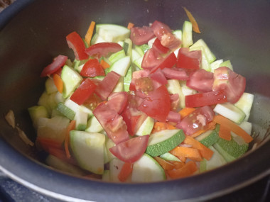 После чего выложите в чашу нарезанные помидоры. Посолите и поперчите блюдо, можете также добавить специи по вкусу. Закройте крышку и переключите мультиварку в режим "Тушение" (или подходящий для тушения). Время выставите 20 минут. Время может отличаться в зависимости от мощности вашей мультиварки и особенностей её работы. Подробнее об этом читайте в статье по ссылке в конце рецепта.