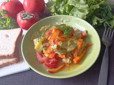 Тушеные овощи с кабачком готовы. При подаче добавьте в блюдо нарезанную зелень. Приятного аппетита!