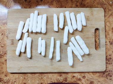 Отрезайте от теста по кусочку и раскатывайте из них длинные колбаски толщиной с мизинец. Затем эти колбаски нарежьте на палочки длиной около 5см.