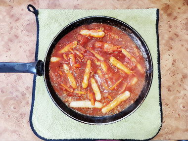 Затем добавьте к ним томатный соус. Перемешайте и потушите блюдо еще 5 минут, чтобы токпокки пропитались соусом.
