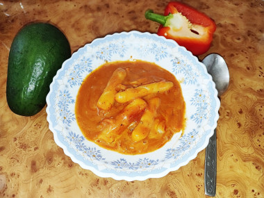 Рисовые токпокки в остром томатном и сырном соусах, как по мне, самостоятельное блюдо, не требующее дополнения. Рисовые токпокки довольно сытные, а пропитка соусами придаёт интересный вкус. Томатный острый соус прекрасно сочетается с сырным соусом. К тому же, ещё обжаренные овощи. В этом блюде ассортимент ингридиентов, взаимодополняющих друг друга. Токпокки лепятся быстро. Стоит только замесить тесто, нарезать на брусочки и скатать ладонью колбаски. Томатный острый соус - соединение томатной пасты с соевым соусом и специями, в данном случае, чайная ложка горького перца на весь рецепт даёт предельно позволительную остроту.