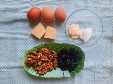 Следовала согласно шагам в рецепте. Первым шагом отделила белки от желтков. Желтки натёрла на средней тёрке. Измельчила чернослив и грецкие орехи. Твёрдый сыр натёрла на крупной тёрке. Перемешала в миске измельчённые чернослив, орехи, сыр и желтки и заправила смесью сметаны и майонеза. Далее выложила массу на белки. Закуска выглядит очень необычно и даёт новые вкусовые ощущения.