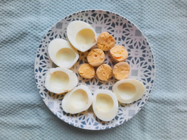 Яйца сварите вкрутую, охладите и очистите. Разрежьте яйца вдоль на две половинки. Желтки отложите для начинки. Как сварить яйца вкрутую? Положите их в холодную воду, поставьте варить на небольшой огонь. Варите яйца 9 минут после закипания, затем залейте холодной водой и остудите. От резкого перепада температур скорлупа лучше очистится. Подробнее о том, как выбирать свежие яйца, читайте в статье по ссылке под шагами.