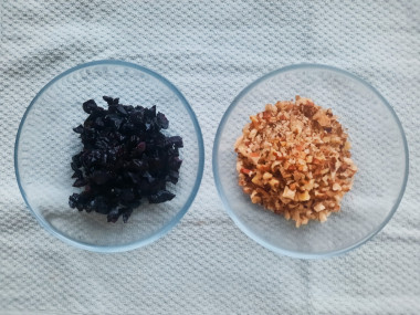 Чернослив нарежьте небольшими кусочками. Если в черносливе есть косточки, удалите их. Если чернослив очень жесткий, залейте его кипятком и оставьте на 15 минут. Затем обсушите и нарежьте.