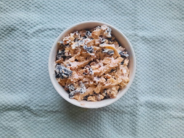 В мисочке смешайте сыр, желтки, чернослив и грецкие орехи. Заправьте массу майонезом и перемешайте. Если масса суховата, добавьте больше майонеза.