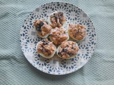Приготовила закусочки яйца с черносливом. Готовится быстро, а вкус очень необычный. Предварительно нужно только отварить яйца. Все предпочтения по количеству ингредиентов можно регулировать самому, но по рецепту пропорции хороши.