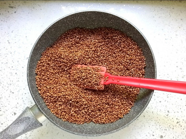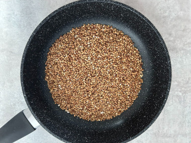 Пока вода закипает, подготовьте гречку. Сухую сковороду прогрейте на огне чуть выше среднего. Выложите гречневую крупу и прокалите, постоянно помешивая, около 5 минут до появления яркого орехового аромата. Прокаливание крупы сделает кашу рассыпчатой и ароматной, а также сократит время варки. О том, как выбрать сковороду, читайте в статье под шагами.