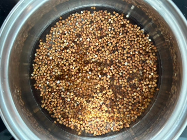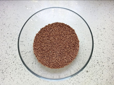 Гречневую крупу переберите. Я после этого выкладываю крупу в сито и просеиваю от лишнего мусора. В какой воде промывать гречку? Промойте крупу холодной проточной водой. Залейте крупу водой, на поверхность сразу всплывут некачественные сухие зернышки и мелкий мусор. Эту воду нужно слить, оставив гречку в миске. Повторить промывку несколько раз, пока вода не станет чистой. Затем откиньте крупу на сито и дайте стечь лишней влаге.