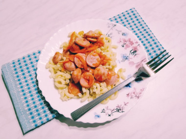 Получилось вкусно - макароны + зажарка из лука и моркови, сосиски и кислинка помидора. Мне понравилось. Для быстрого ужина очень даже неплохо. Спасибо автору Юлии за легкий рецепт.