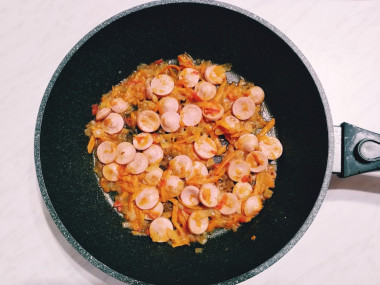 Добавьте к овощам обжаренные сосиски, перемешайте.