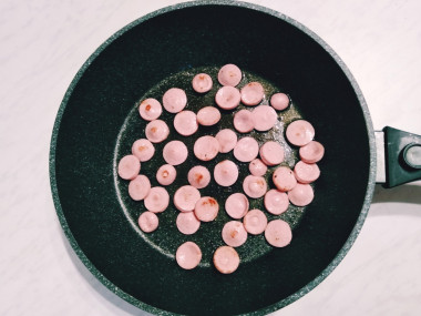 На сковороде разогрейте растительное масло. Выложите на сковороду кружочки сосисок. Обжарьте сосиски на умеренно сильном огне до румяности с двух сторон. Советы по выбору сковороды читайте по ссылке в конце рецепта.
