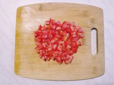 Помидор помойте, нарежьте небольшими кубиками. По желанию кожицу с помидора можно снять.
