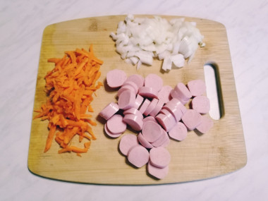 Сосиски освободите от оболочки, нарежьте кружочками.