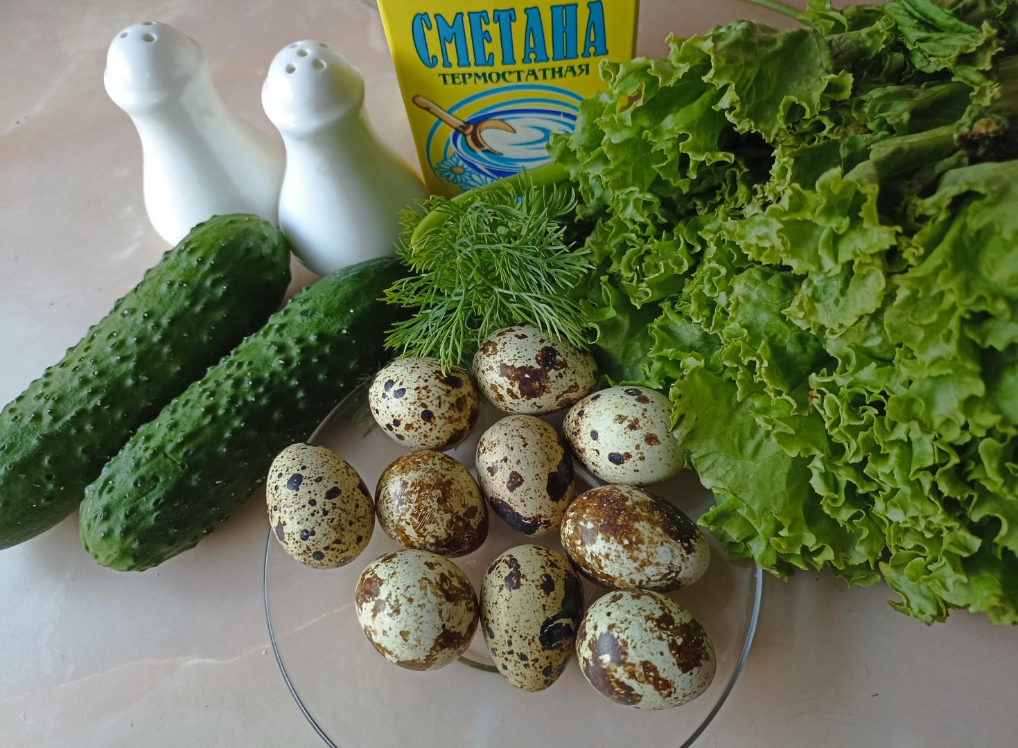 Как приготовить салат Весенний с огурцом и яйцом? Подготовьте все ингредиенты по списку. Перепелиные яйца вы можете заменить на куриные (потребуется 2 яйца), а вместо сметаны использовать майонез или греческий йогурт без сахара и фруктовых добавок. Зелень можно взять любую, например, укроп, петрушку, кинзу или базилик.Шаг 2: