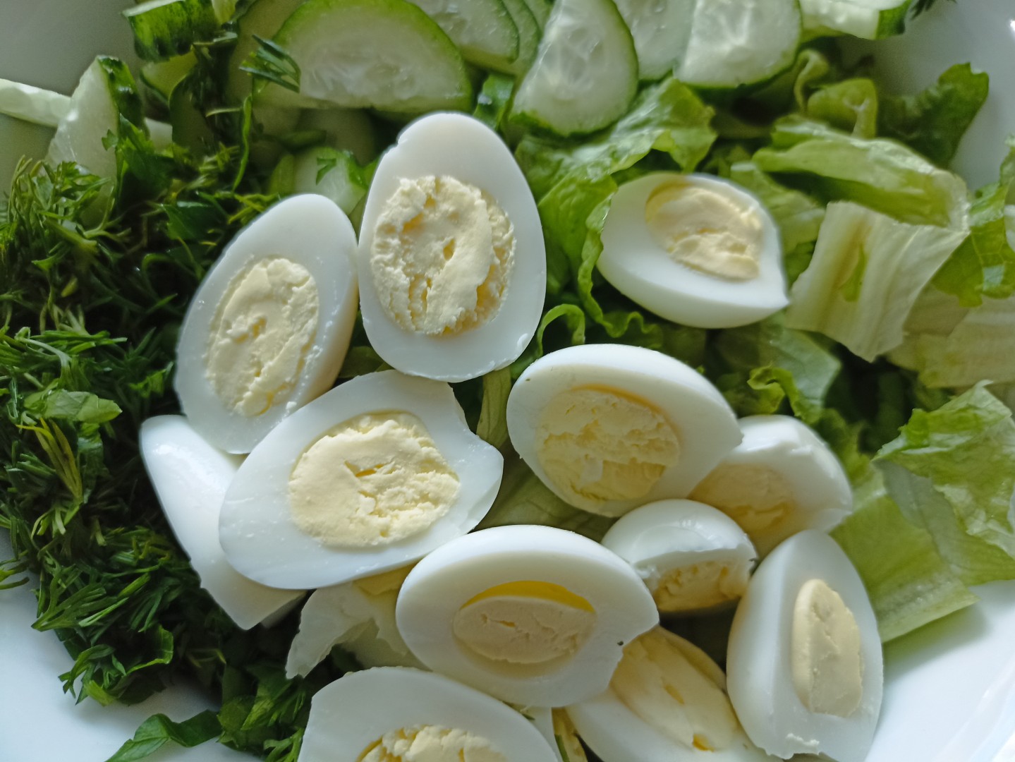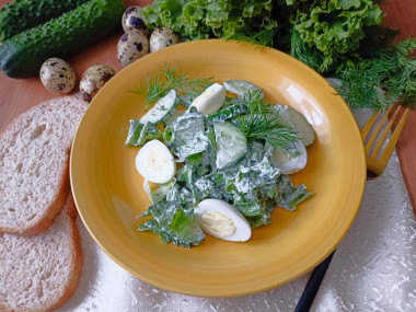 Приготовила салат Весенний с огурцом и яйцом. Вместо айсберга использовала обычный листовой салат. Свежие овощи, зелень- именно то, чего хочется весной! Перепелиные яйца и сметана отлично дополняют этот салат. Сочно, вкусно, полезно! Спасибо автору за рецепт!