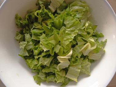 Листья салата Айсберг помойте и обсушите полотенцами, чтобы вода не попала в салат. Порежьте листья квадратиками или произвольными кусочками. Старайтесь, чтобы они были не слишком большими. Салат смотрится гармонично и красиво, когда все ингредиенты в нем примерно одного размера.Шаг 5: