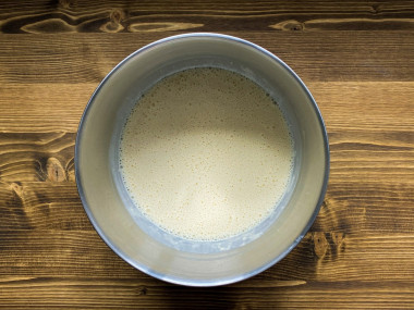 Кефир подогрейте до теплого состояния, но не переусердствуйте, чтобы он не свернулся. Отлейте примерно половину всего количества кефира в чашку. Вбейте в оставшуюся часть яйцо, всыпьте сахар и соль. Перемешайте венчиком продукты до однородного состояния.