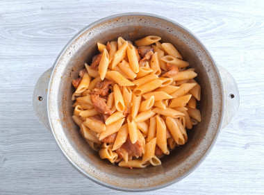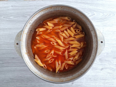 Тушите на медленном огне под крышкой около 15 минут до готовности макарон и выкипания лишней влаги.