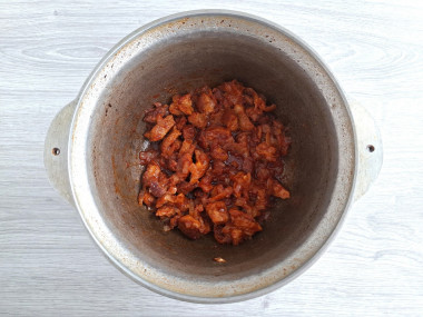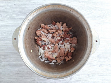 В казане на сильном огне разогрейте растительное масло. Выложите мясо и обжарьте, помешивая, около 5 минут или чуть дольше до золотистой корочки. Как выбрать сковороду и растительное масло для жарки читайте в статьях на эти темы. Ссылки в конце рецепта.