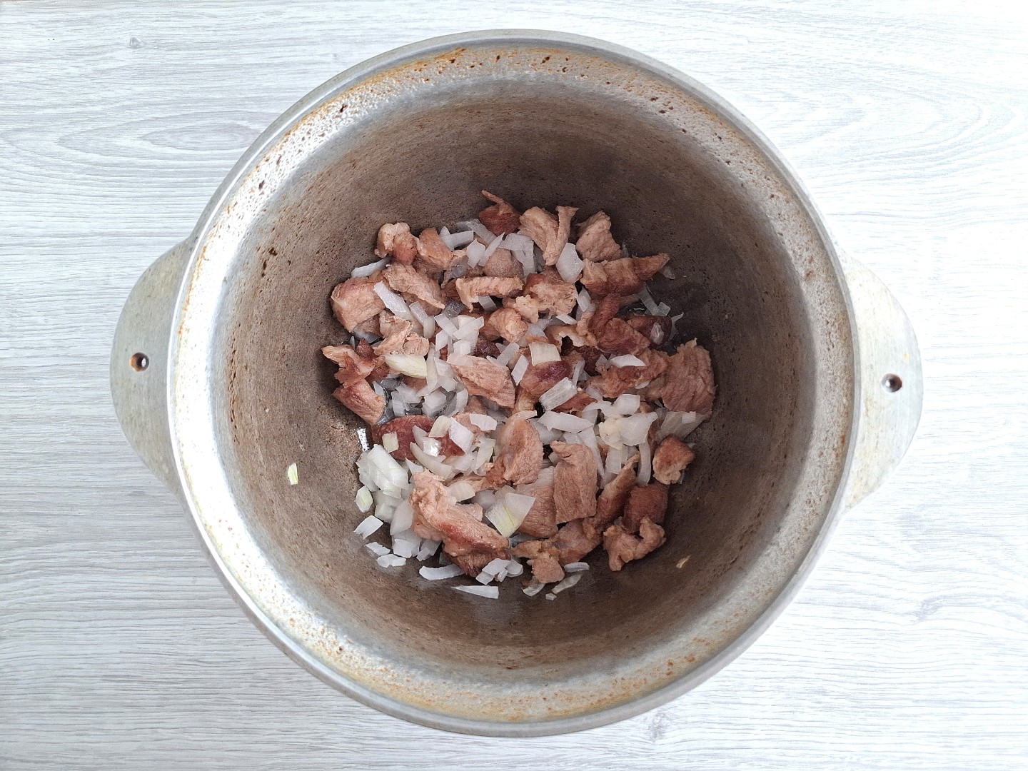Высыпьте в казан лук, перемешайте и жарьте еще около 5 минут.