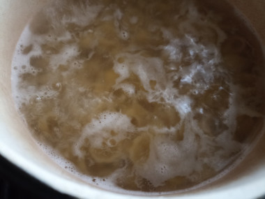 Когда вода закипит, добавьте в нее соль. Закиньте макароны, перемешайте. Варите макароны по времени, указанном на упаковке. Периодически помешивайте их. Когда макароны будут готовы, откиньте их на дуршлаг и оставьте на время, чтобы стекла вся вода.