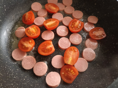 Поставьте на средний огонь сковороду. Растопите на ней сливочное масло. Выложите на сковороду сосиски и помидорки. Обжаривайте их, помешивая, около 5 минут, до легкого румянца. О том, как подобрать идеальную сковороду, читайте в статье по ссылке в конце рецепта.