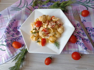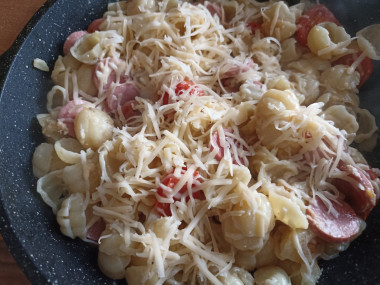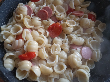 На ужин приготовила макароны с сосисками и сыром. Макароны выбрала в форме ракушек, отварила их в подсоленной воде до готовности. В это время обжарила на сливочном масле нарезанные кружочками сосиски и помидоры черри. Добавила к ним на сковороду ракушки, залила яйцом, смешанным с молоком, перемешала, посыпала натёртым сыром. Получился вкусный, сытный ужин, который просто и быстро готовится и ещё быстрее съедается))). Спасибо за рецепт, katushafin!